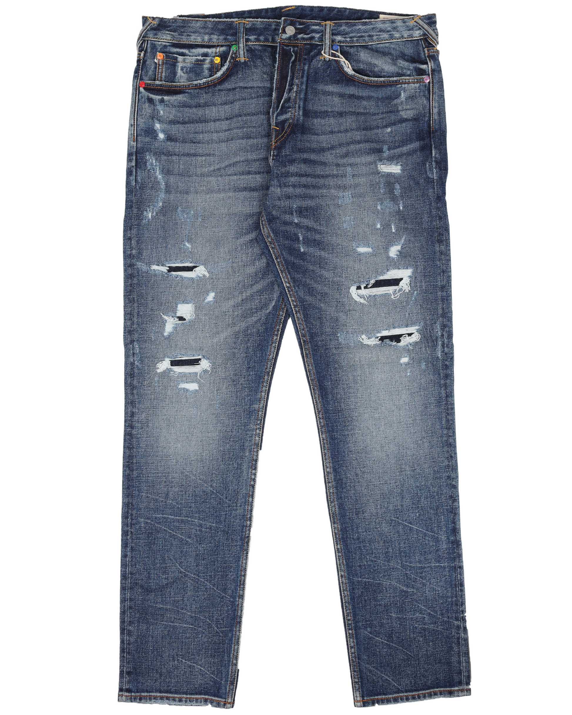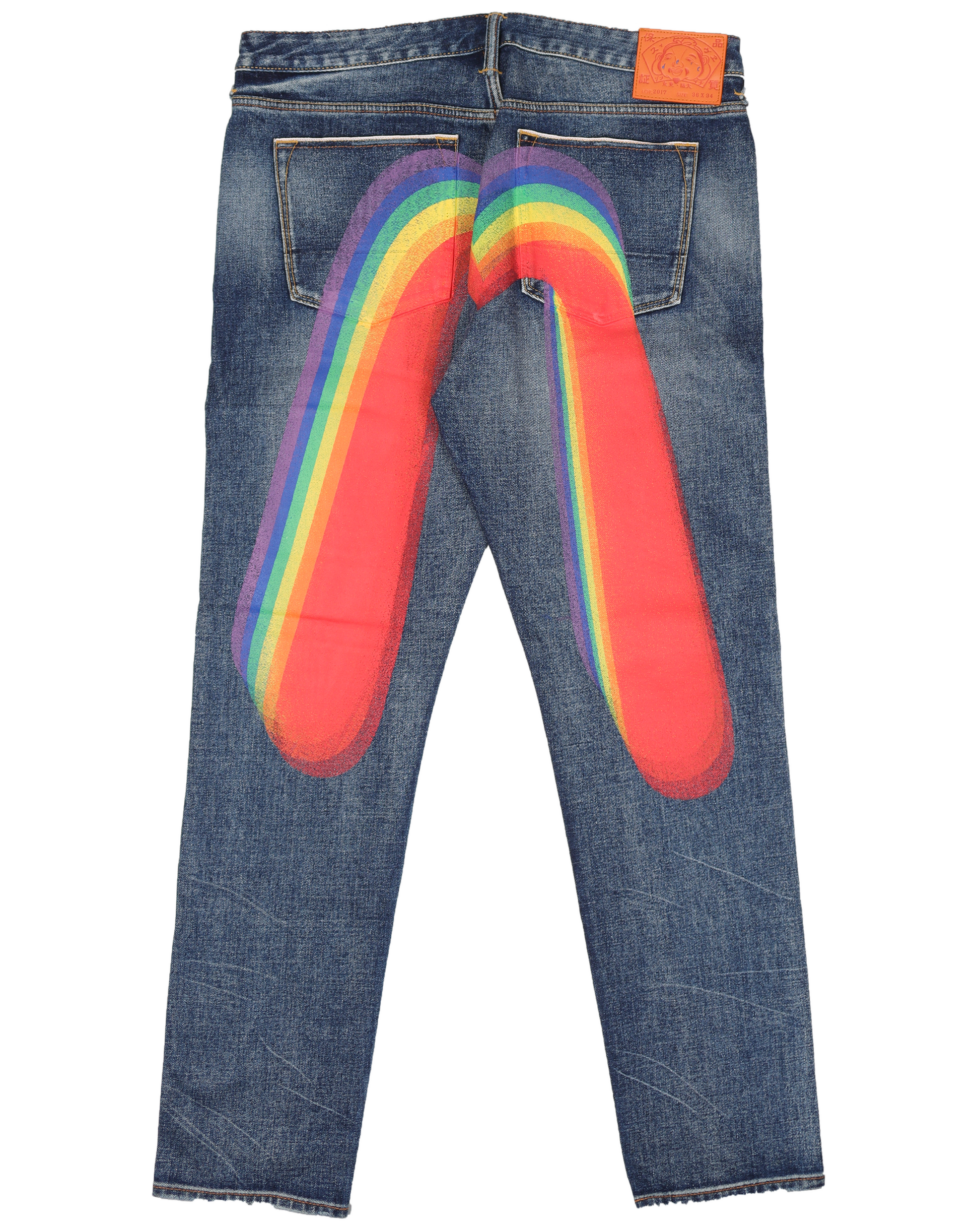 EVISU partners with Edison Chen, a renowned name in street fashion industry and a long-time friend of the brand to celebrate EVISU's 30th anniversary. This pair of carrot-fit jeans is considerably washed with distressed details, featuring a rainbow Daicock printed on the back with worn effect and colorful rivets. The godhead in tears leather patch pressed with 「e」,「d」and「c」further echo the fun-filled vibe.