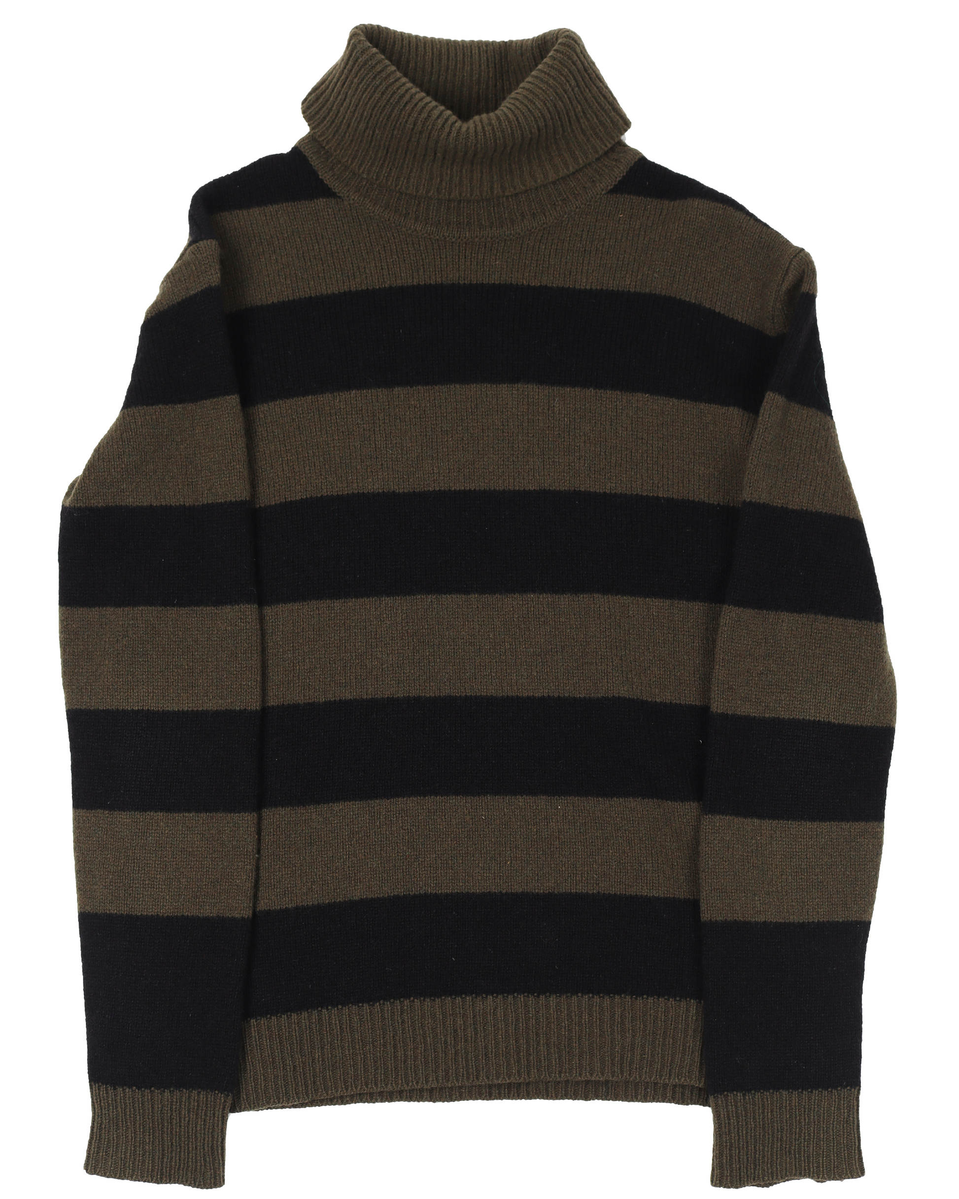 Striped turtlenecks were a key factor of the runway presentation. Shown layered and unlayered, they appeared numerous times in a variety of patterns. This block-striped wool version features a slim silhouette with the military color scheme used repeatedly throughout the collection.