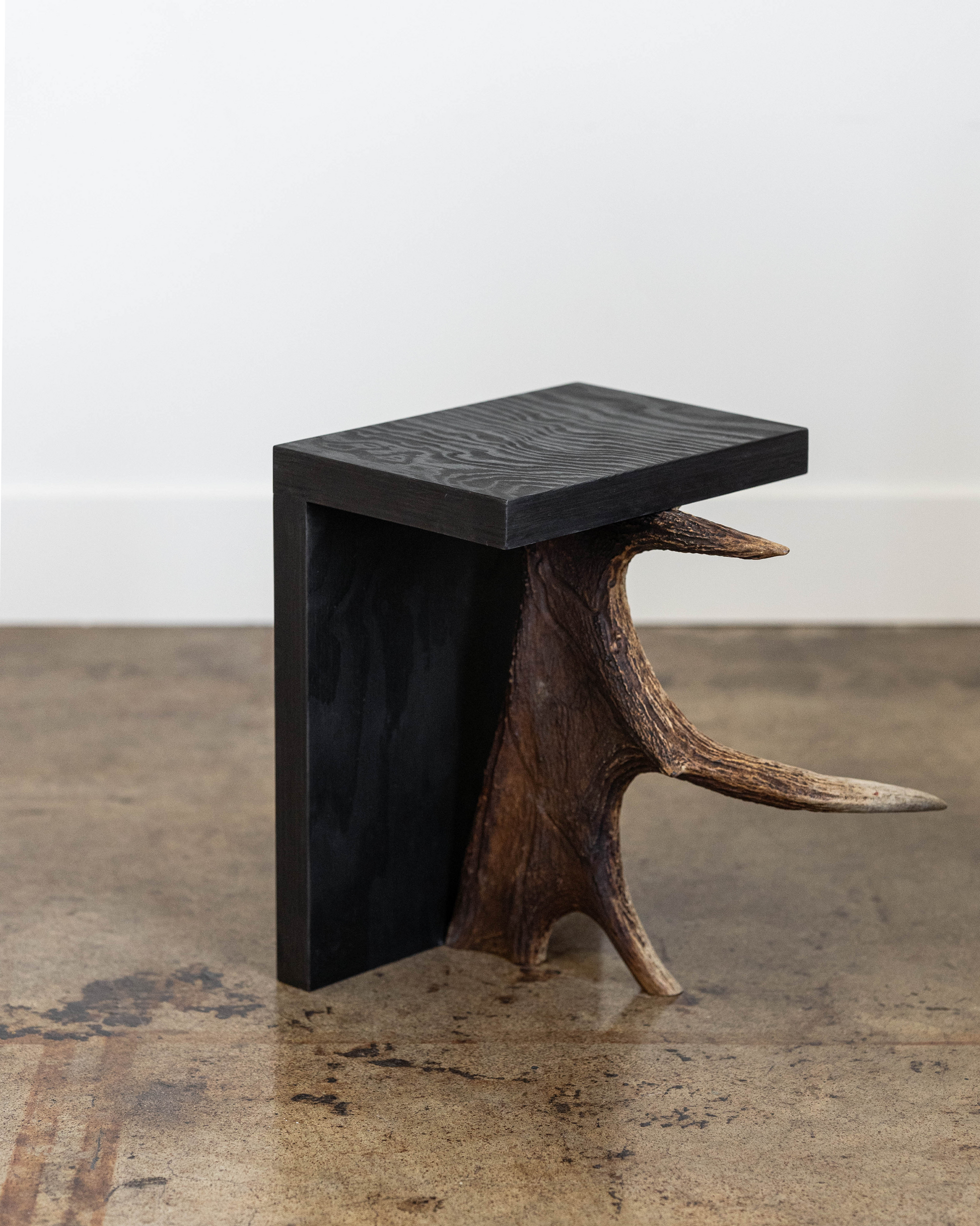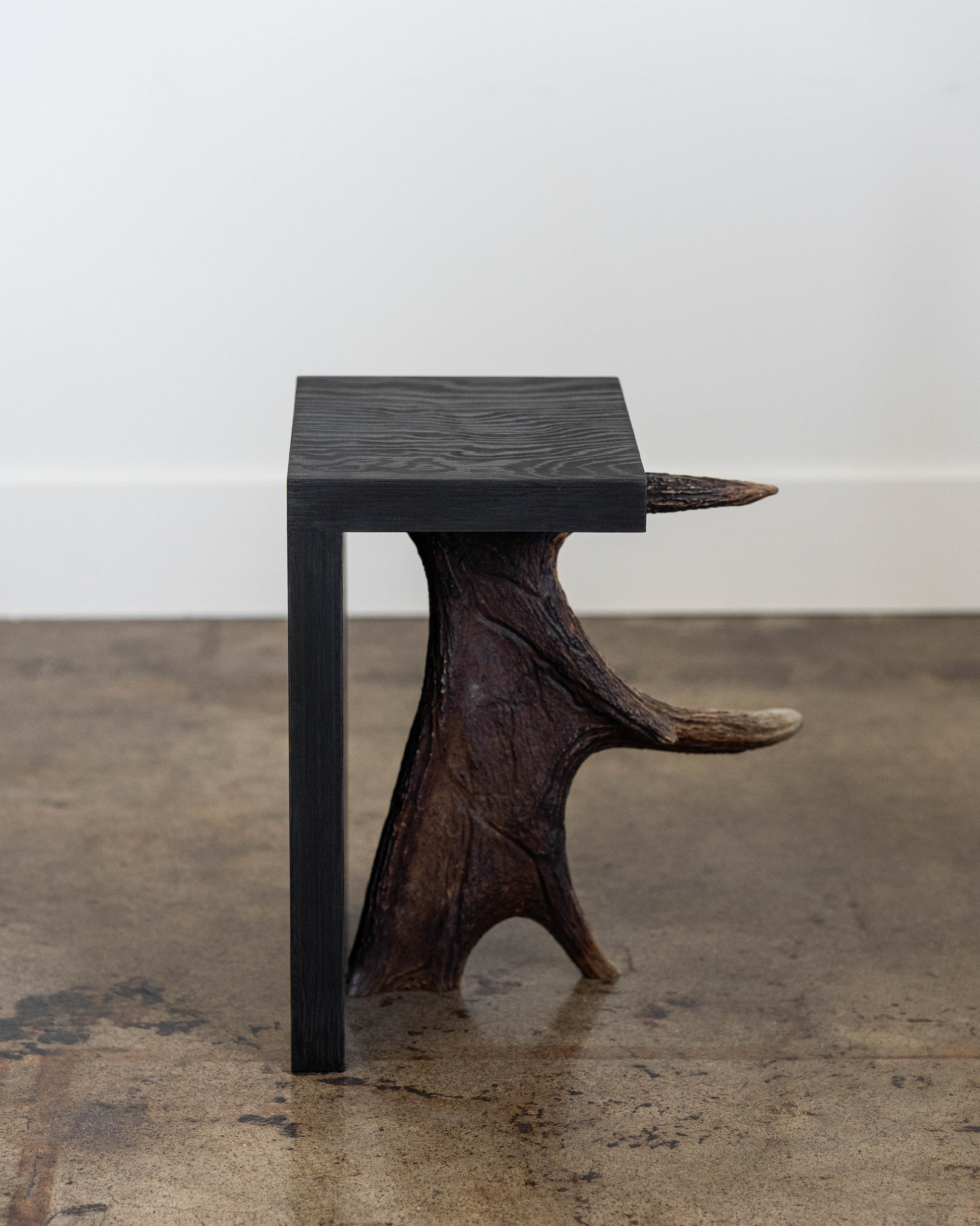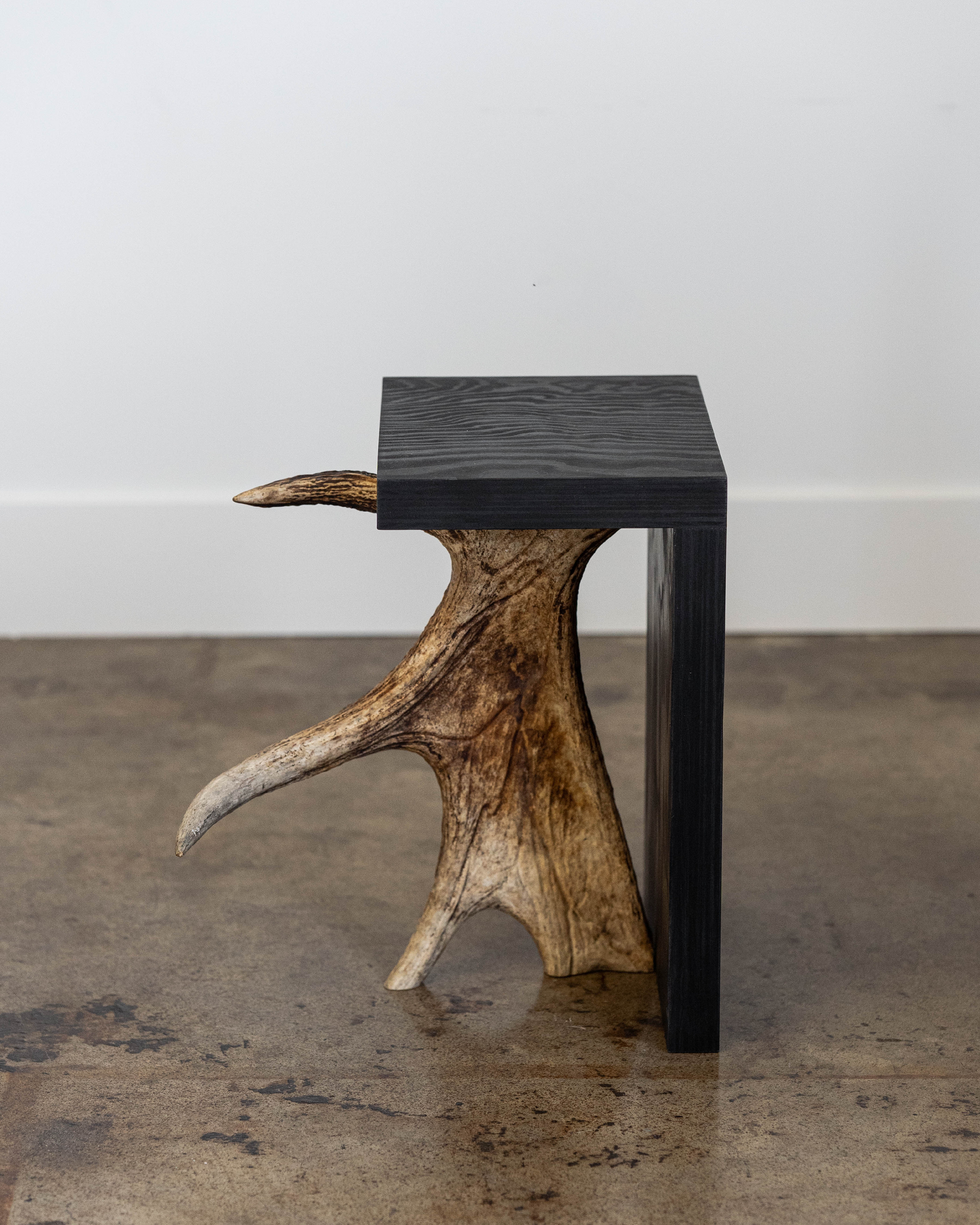 Rick Owens Stag T in black plywood has a T-shape structure and a natural antler moose horn on the side. Each piece of Stag T is made with a natural moose horn.