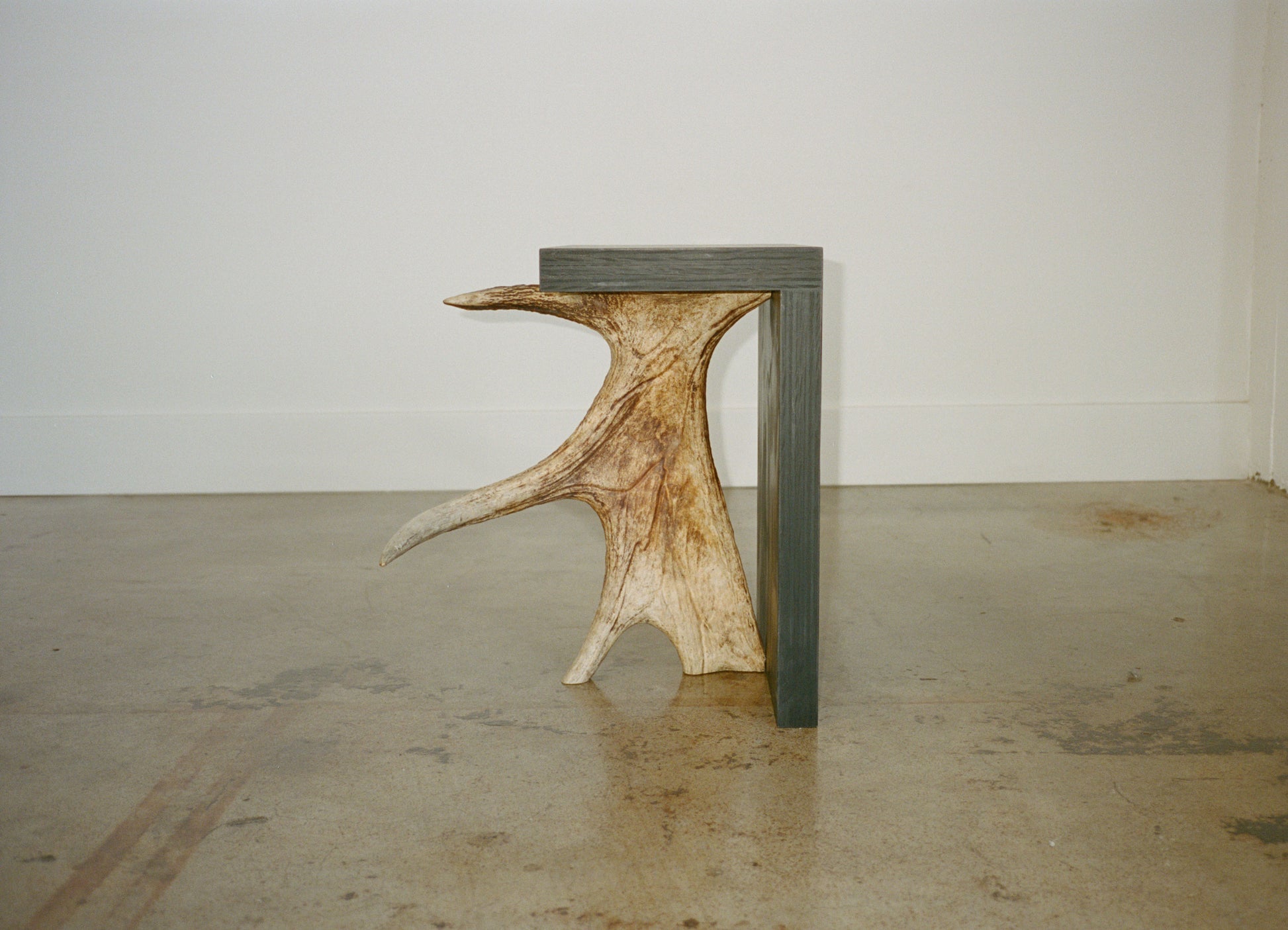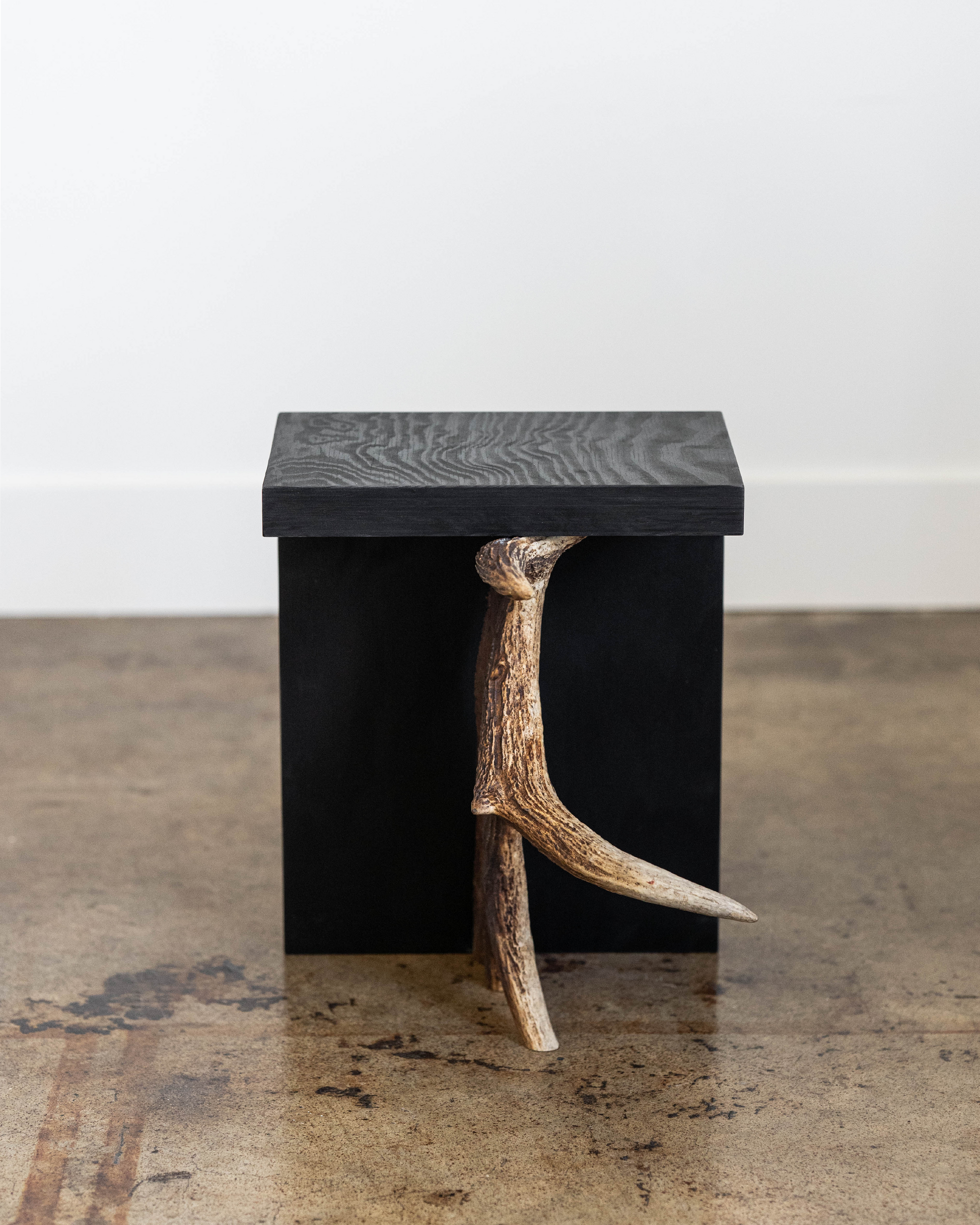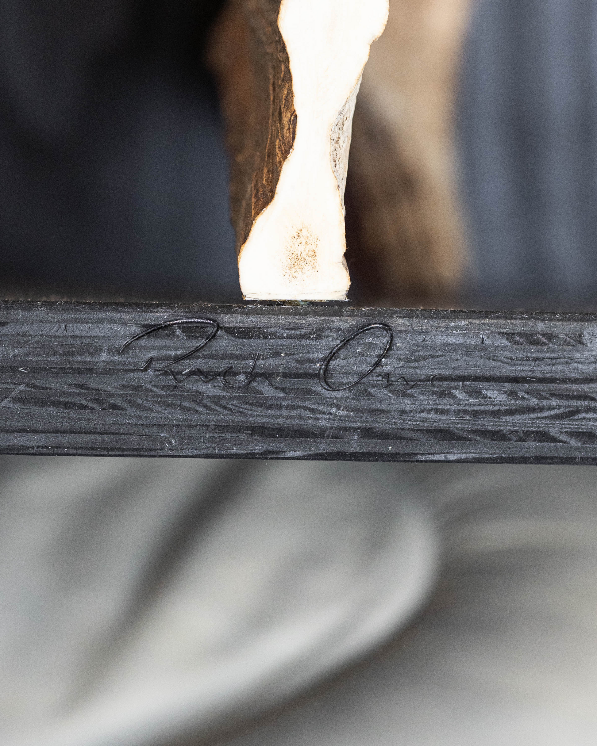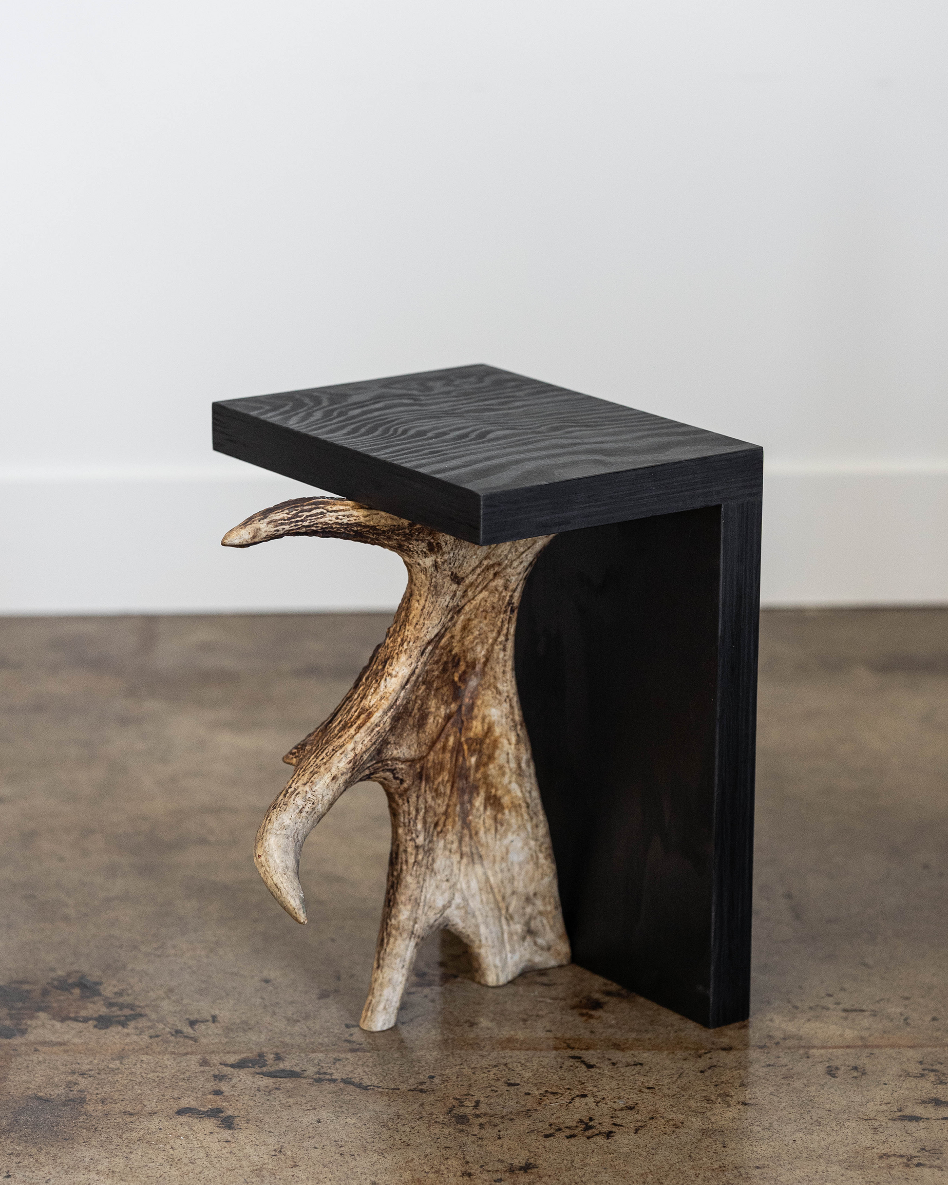 Rick Owens Stag T in black plywood has a T-shape structure and a natural antler moose horn on the side. Each piece of Stag T is made with a natural moose horn.